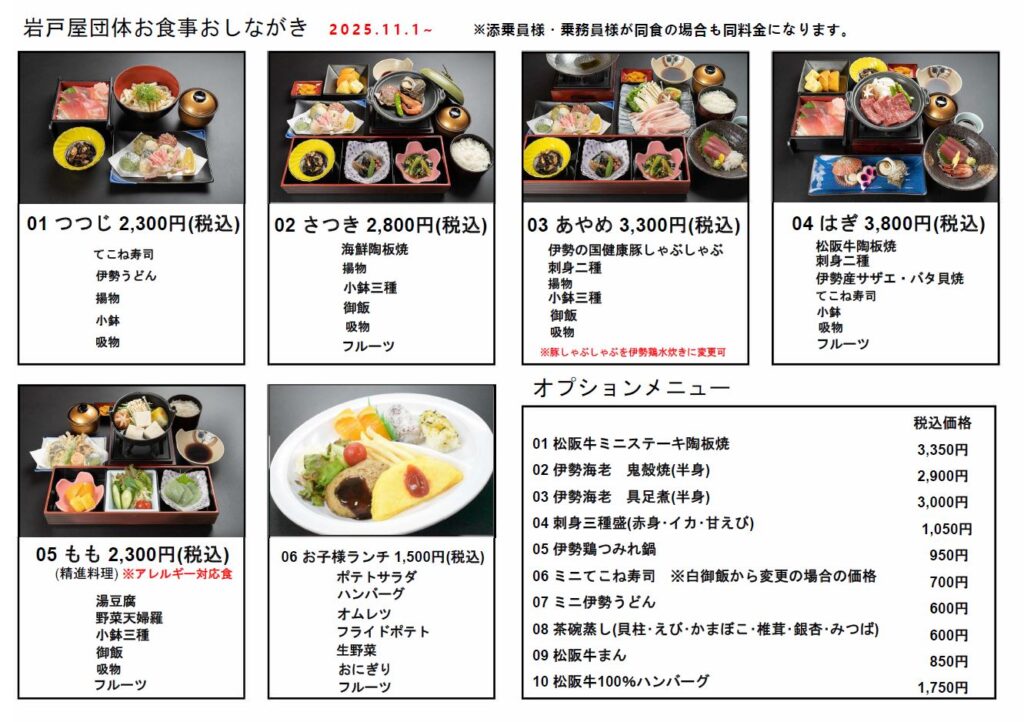 2025年11月1日より、お食事メニュー(一般向け・団体専用)の価格を改定させていただきます。